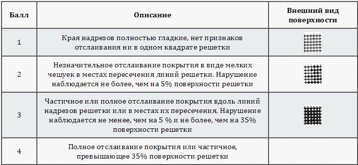 Баллы определения и оценки адгезии 1-4 (по ГОСТ 15140 метод решетчатых надрезов)