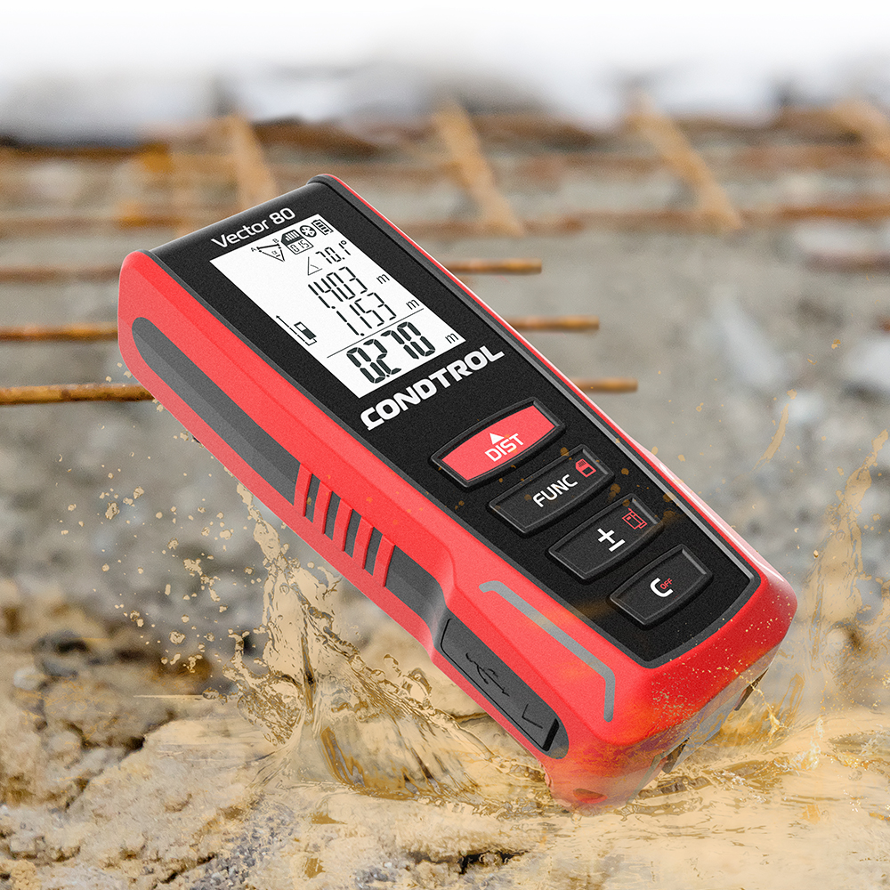 Пылевлагозащита IP 54 — Благодаря герметичному корпусу, лазерная рулетка надежно защищена от брызг воды и пыли. Большие силиконовые кнопки не потрескаются на морозе, их удобно нажимать даже в перчатках. Это позволяет использовать CONDTROL Vector 80 в условиях стройплощадки.