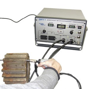 Дефектоскоп магнитопорошковый универсальный ДМПУ-1 применяется для намагничивания объектов контроля или их участков в режимах импульсного, переменного, постоянного магнитного поля. Импульсное намагничивание происходит в процессе пропускания тока по участку объекта или по кабелю, намотанному на изделие. Намагничивание постоянным и переменным полем производится катушками или электромагнитом. Для всех режимов предусмотрено размагничивание до исходного состояния.