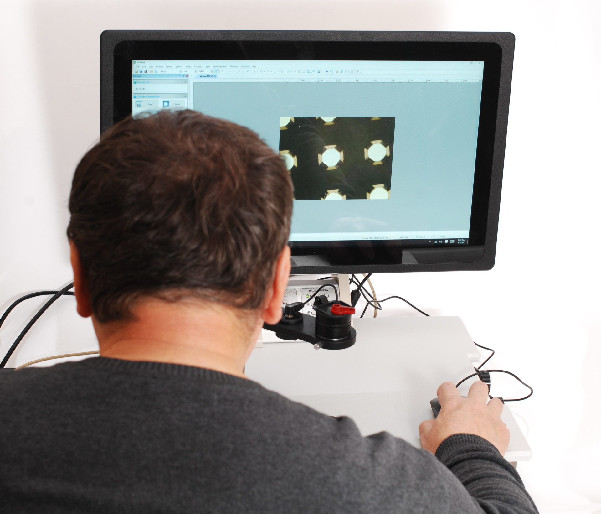 Оператор измеряет образцы на сенсорном экране или компьютерной мышью с клавиатурой;