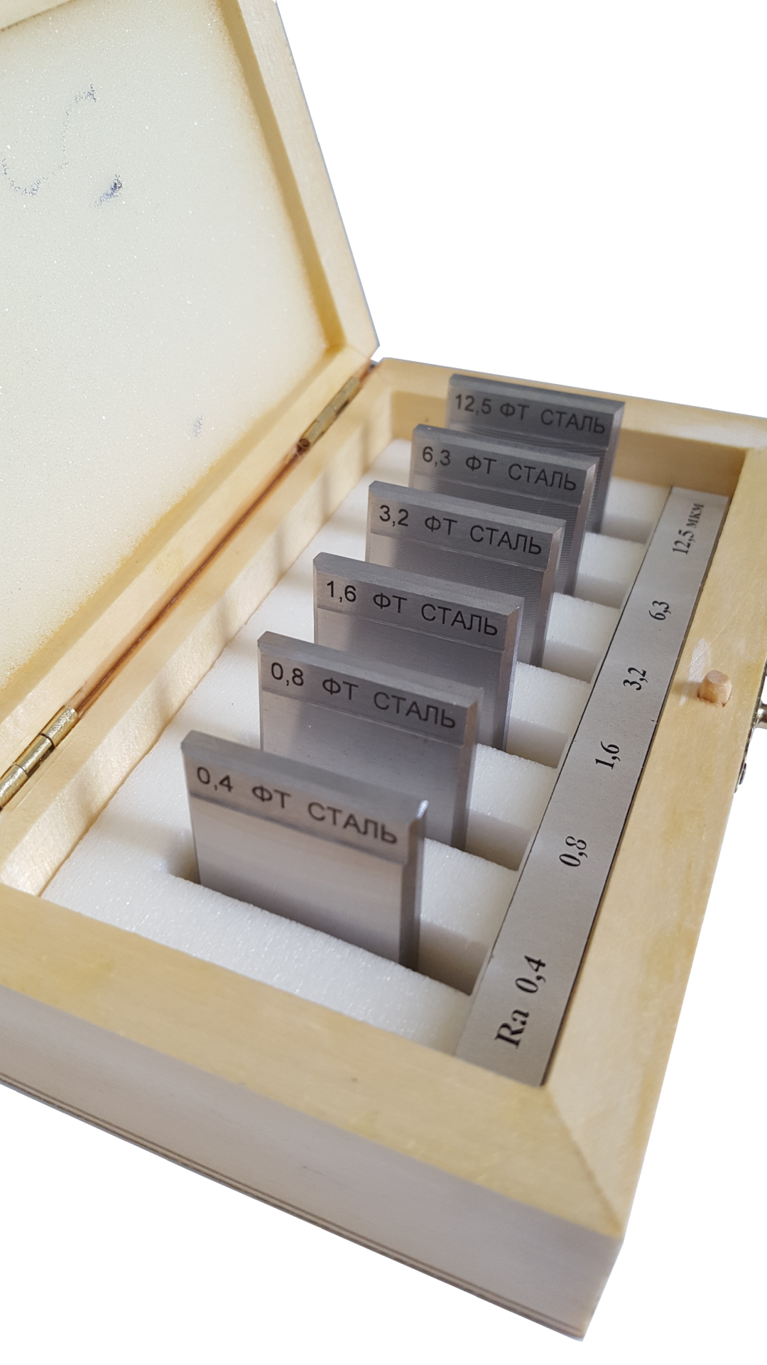 Образцы изготавливаются с различными номинальными значениями параметра шероховатости Ra, выбранными из ряда номинальных значений, допускается дополнительно оценивать поверхность образцов параметрами шероховатости Rz, Rmax, Sm, S и др., значения которых не нормируются и приводятся как справочные по результатам измерений. Также можно заказать комплект из 6 шт, состоящий не из образцов с различными номинальными значениями параметра шероховатости Ra, а комплект только с одним или двумя номинальными значениями параметра шероховатости Ra, например: 0,1; 0,2; 0,3 и далее по выбору заказчика.