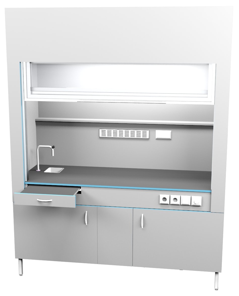 Шкаф вытяжной с сантехникой ШВ НВК 1800 МОН+ (1800×716×2200). Описание: Вытяжные лабораторные шкафы применяются при работе с токсичными и вредными летучими материалами, с чистыми материалами, с растворением или разложением под температурной обработкой, при проведении анализа проб и многих других. Особенности: Полипропиленовая раковина, обладающая высокой химической стойкостью Химически стойкий кран из латуни с полипропиленовым напылением для подключения холодной воды Дополнительная подсветка сбоку с плавной регулировкой Выдвижной столик Вытяжка из нижней тумбы позволяет хранить в ней реактивы Ударопрочный подъемный кран легко поднимается одной рукой Экран в поднятом состоянии не увеличивает высоту шкафа Внутри рабочей камеры полочка для хранения реактивов Две влагозащищенных розетки с крышкой внутри рабочей камеры Специальные доводчики в тумбе позволяют закрывать тумбу бесшумно По заказу столешницы могут быть выполнены из: химстойкого пластика керамогранита (плитка) полипропилена нержавеющей стали монолитной керамики эпоксидного керамзита