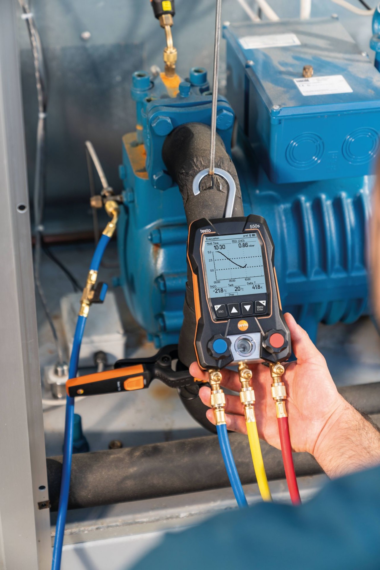 Этот комплект предназначен для беспроводных измерений, необходимых для пусконаладки, сервисного и технического обслуживания холодильных систем, систем кондиционирования и тепловых насосов: в комплект входят цифровой манометрический коллектор testo 550s с 2-х ходовым блоком клапанов и Bluetooth, два зонда-зажима для труб testo 115i (Bluetooth, NTC) и прочный кейс для транспортировки. Дополнительные Bluetooth-зонды, например, testo 552i для беспроводного и бесшлангового измерения вакуума, можно заказать отдельно.
