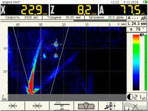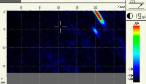 • Контроль в системе трехуровневой оценки величины отражателя: «поиск-контроль-брак» с цветовой градацией уровней образов томограммы и автоматическим сравнением их с опорным уровнем.
