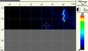 Существует возможность вывода на экран прибора томограмм В-типа при перемещении вертикально-ориентированного курсора по реконcтруированному изображению для наглядного отображения внутренней структуры объекта контроля.