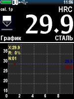 — большой цветной графический дисплей. Помимо имеющихся 88 комбинаций шкал твердости и материалов (калибровок), прибор дает возможность дополнительно настроить пользовательские шкалы и материалы. Информацию можно отобразить в виде гистограмм, графиков, таблиц, есть интеллектуальный режим, отображение отклонения, среднего, большое количество другой статистической информации; — прибор позволяет хранить и просматривать архив измерений, сохранять на карту памяти калибровки;
