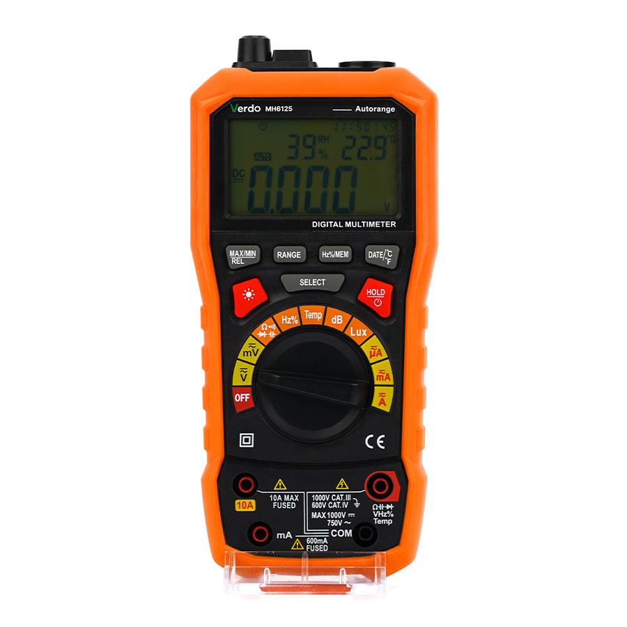 Мультиметр VERDO MH6125 – это многофункциональный ручной цифровой мультиметр с большим многострочным жидкокристаллическим дисплеем, что облегчает лёгкое считывание показаний. Мультиметр оснащен встроенным измерителем параметров окружающей среды (звук, освещённость, влажность, температура). Этот многофункциональный измерительный прибор идеально подходит как для профессионального использования на производстве, ремонта и сервисного обслуживания, так и для обучения и бытового применения.